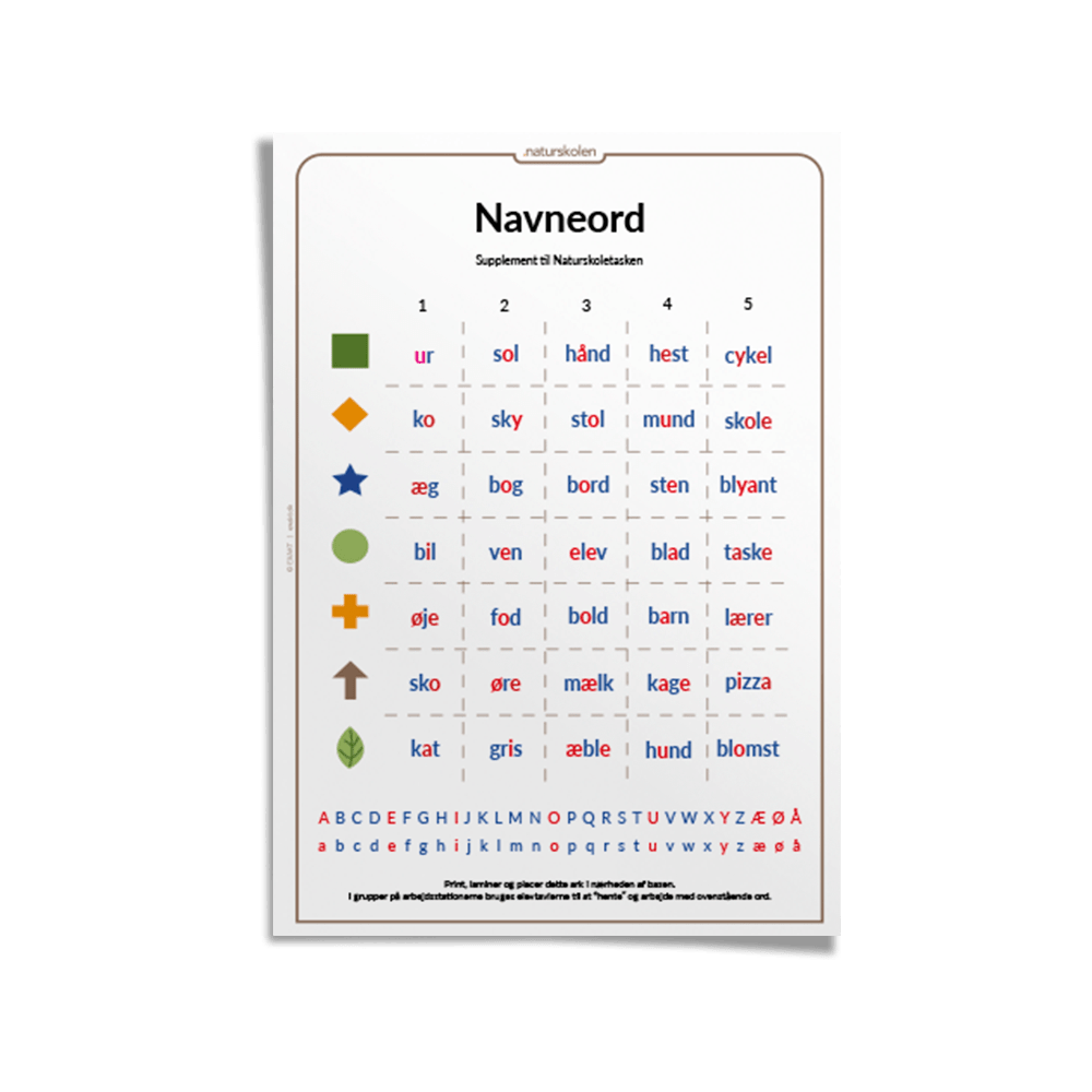 Disse navneord er udviklet som supplement til ‘Udeskolen’ og indholdet i Udeskoletasken, men kan også anvendes selvstændigt sammen med elevtavlen i print-selv udgaven.