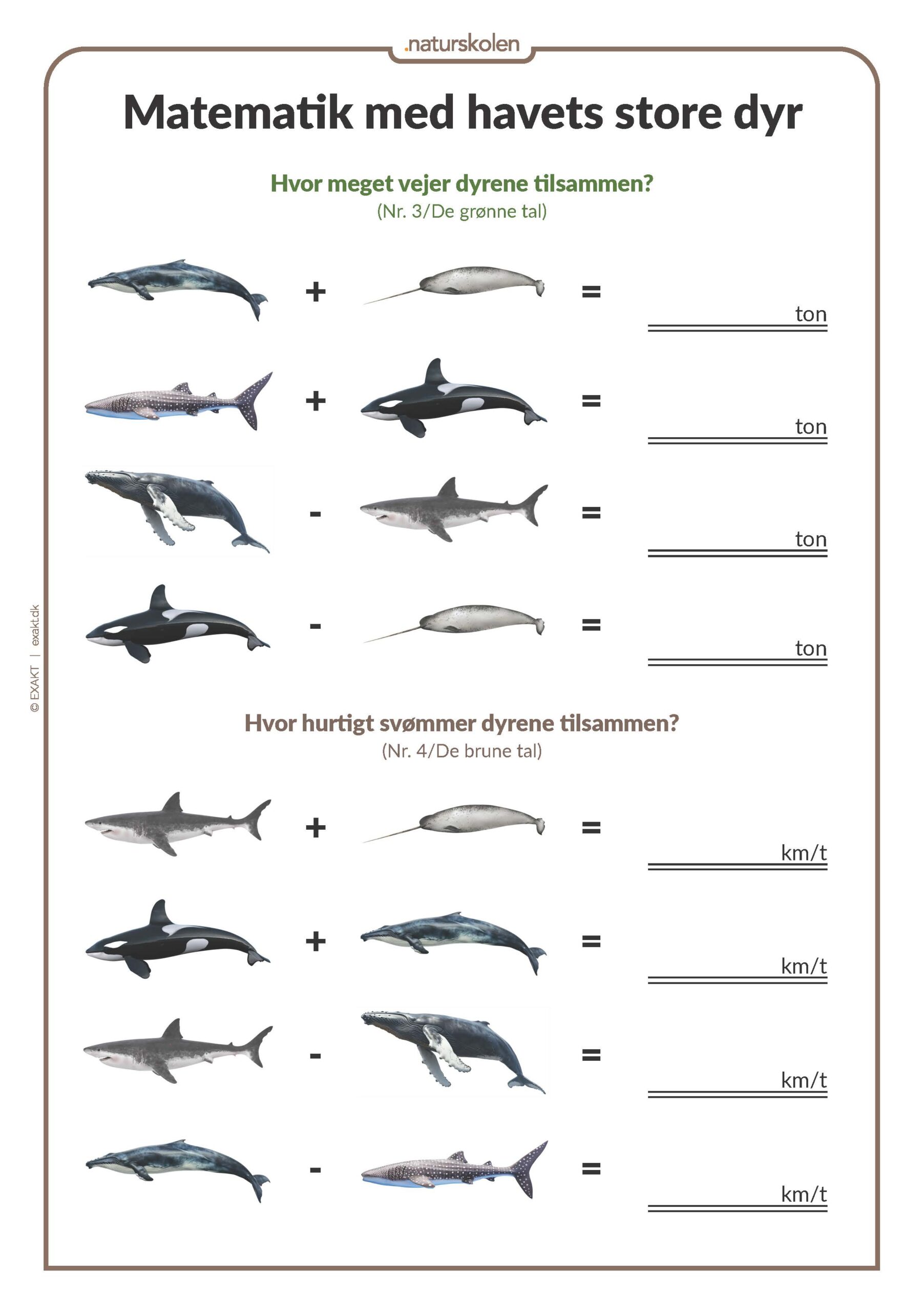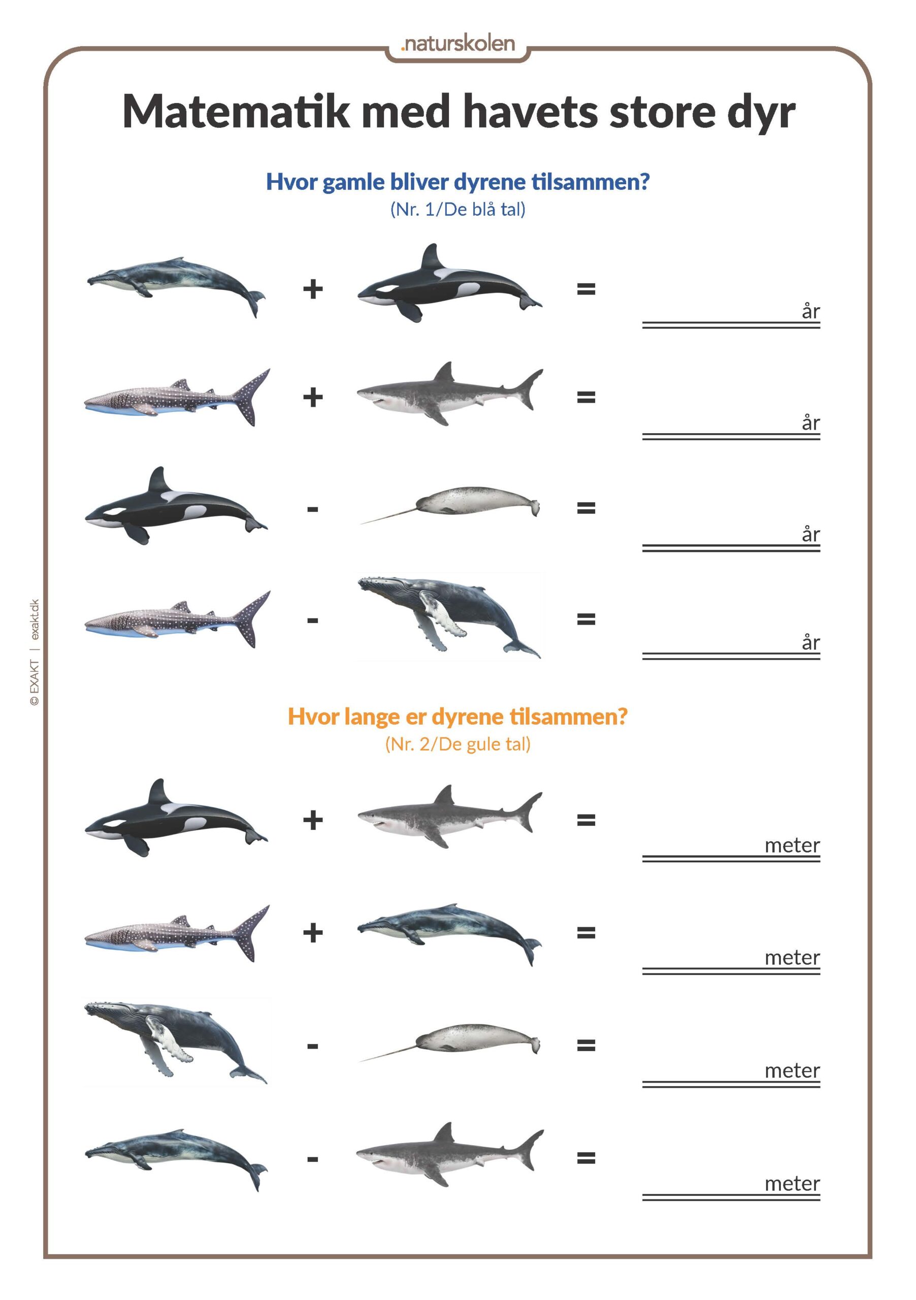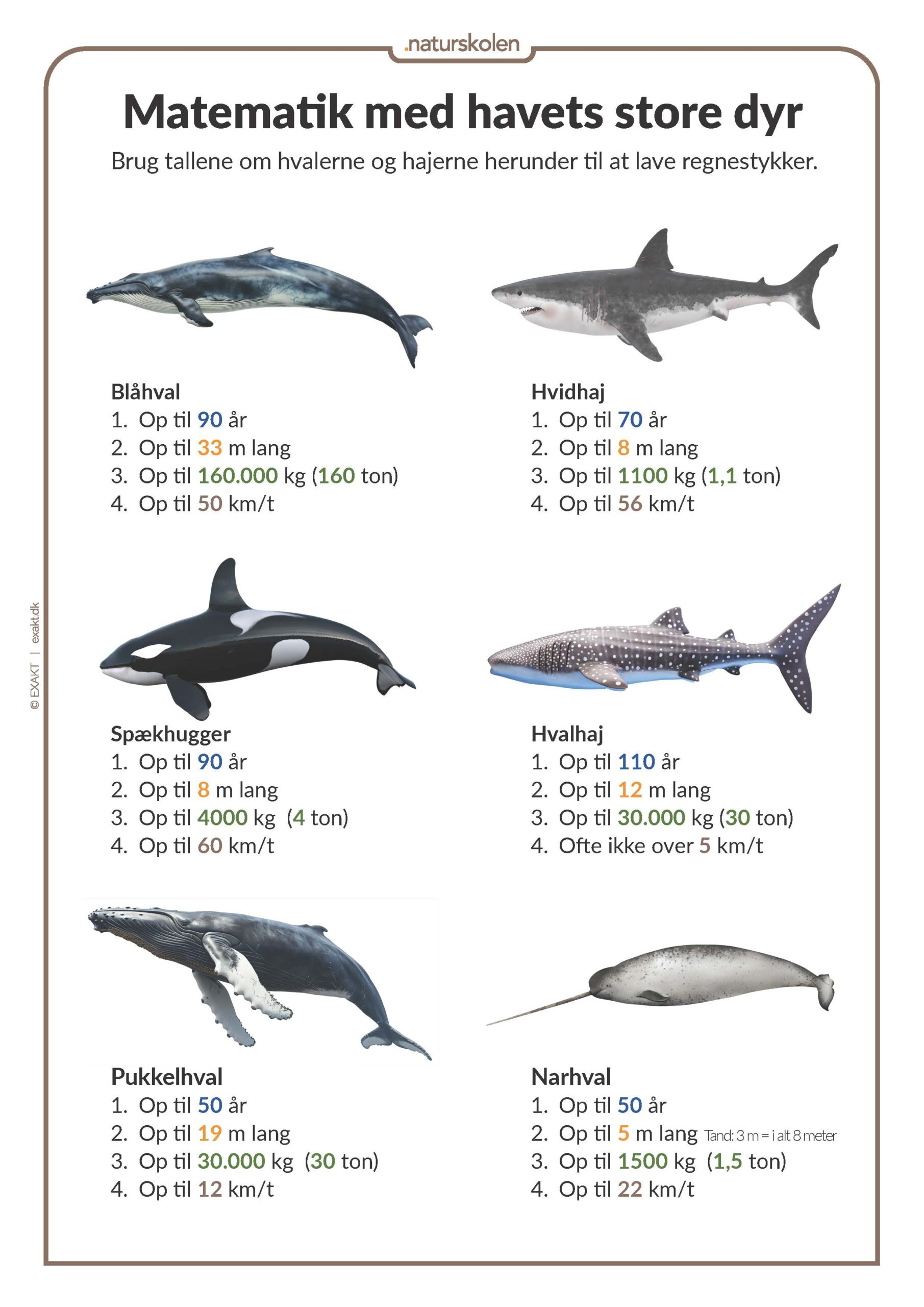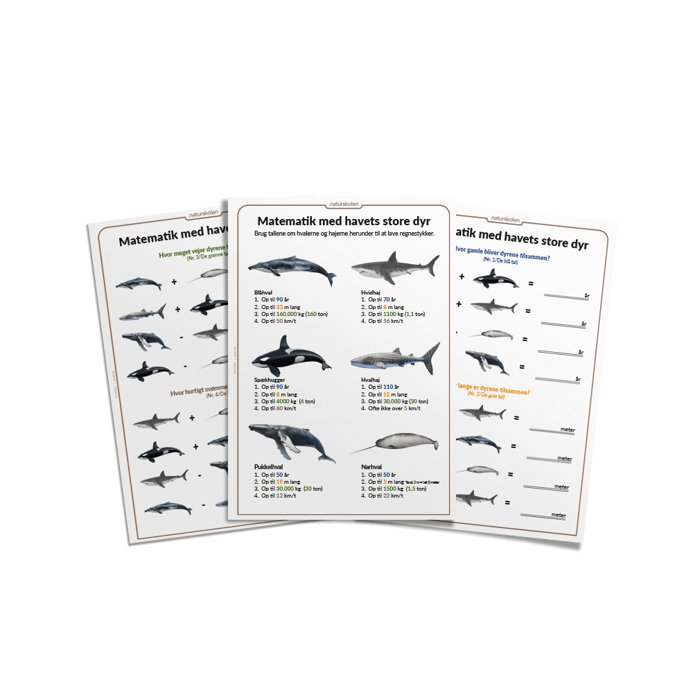 Disse opgaver er udviklet til ‘Udeskolen’ men kan bruges selvstændigt og tværfagligt med naturfagene. Kombiner med fysiske aktiviteter udendørs. Gå fx ud på boldbanen eller i skolegården og vis med kridt eller snor, hvor store de fantastiske havdyr er i virkeligheden.