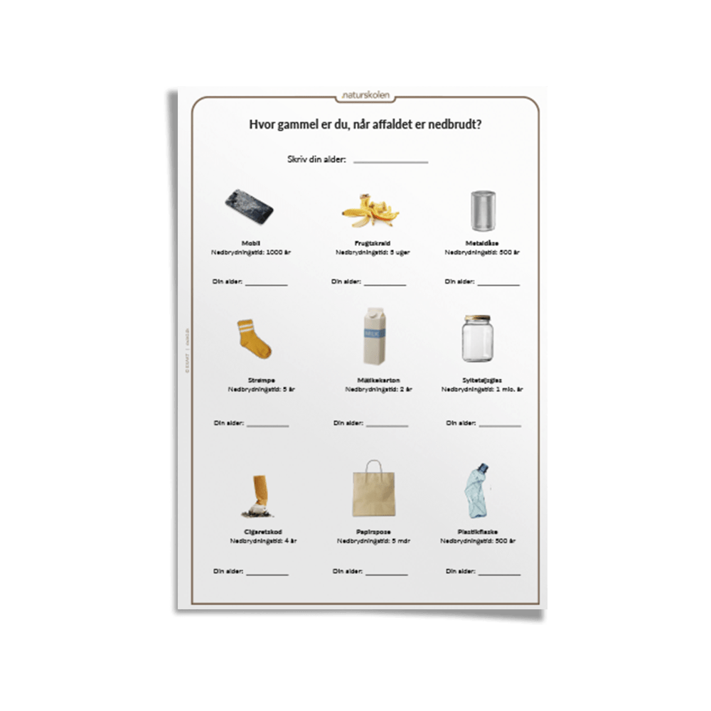 9 forskellige genstande hvorpå eleverne skal notere deres alder ift. nedbrydningstid.