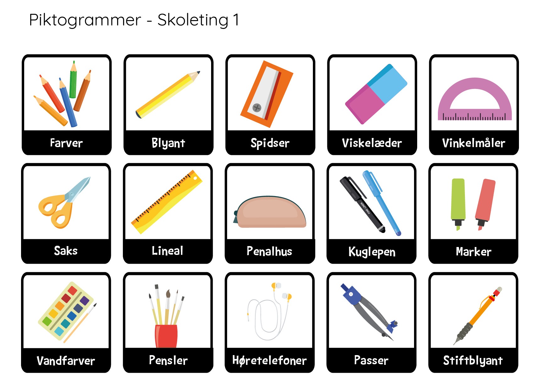 I alt 30 piktogrammer med ting, der findes i skolen.