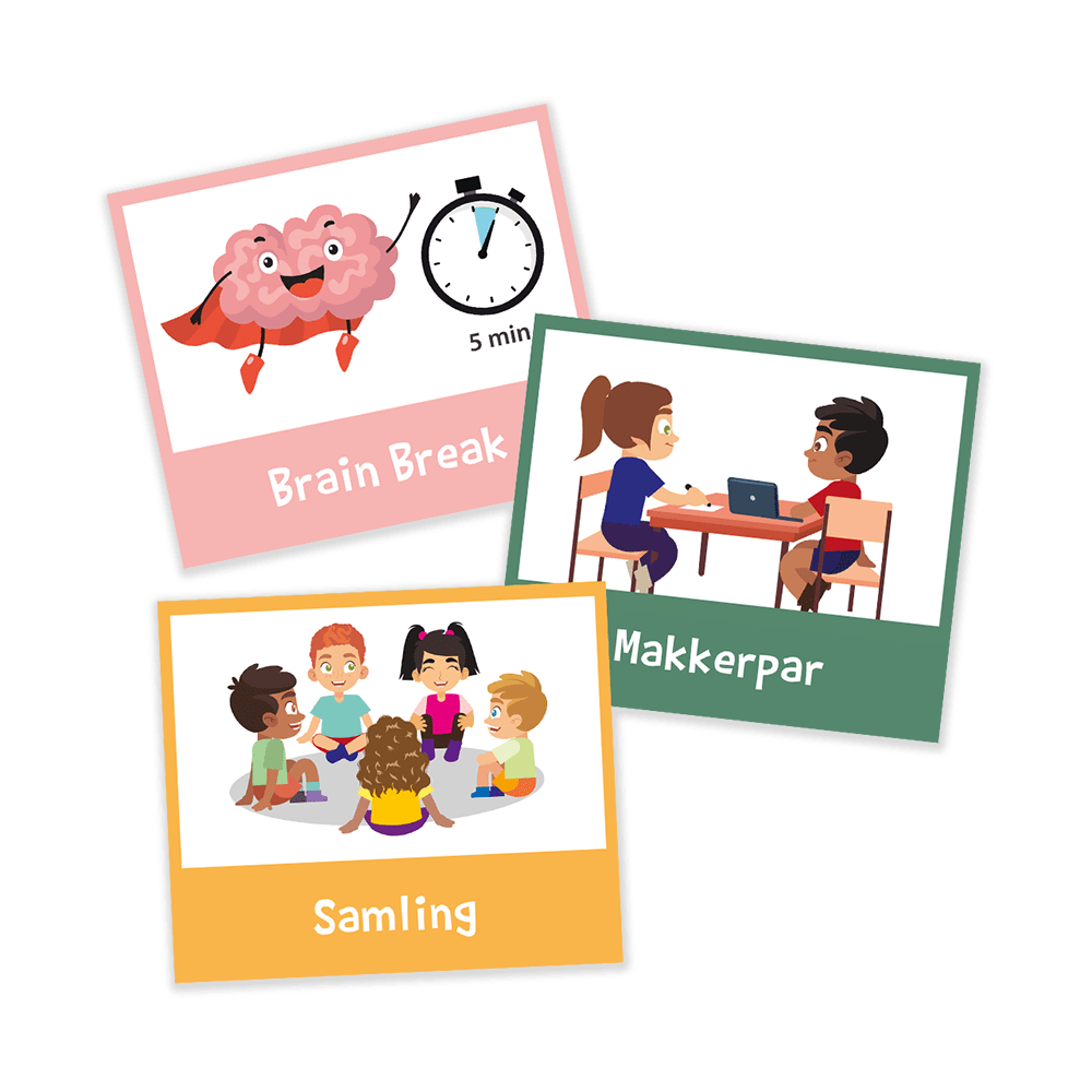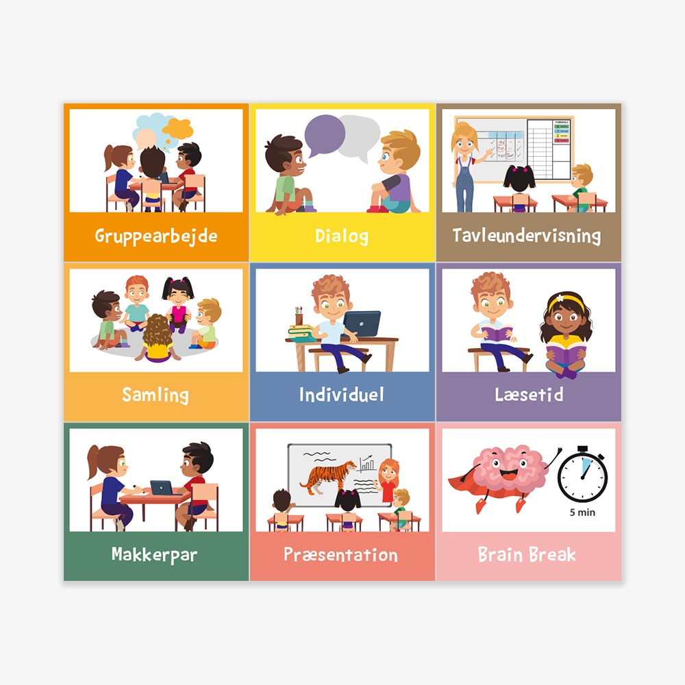 Piktogrammer med arbejdsformer gør det visuelt, og dermed nemmere for eleverne at huske og leve op til den måde der skal arbejdes på. Det er trygt for eleverne, nemt for de voksne og kan reducere graden af uro og forstyrrelser.