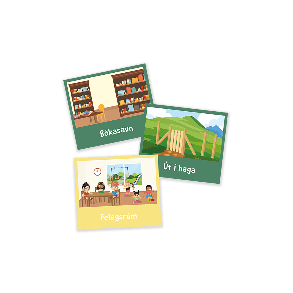 • 20 piktogrammer med indendørs og udendørs lokationer i størrelsen 13×11 cm.
