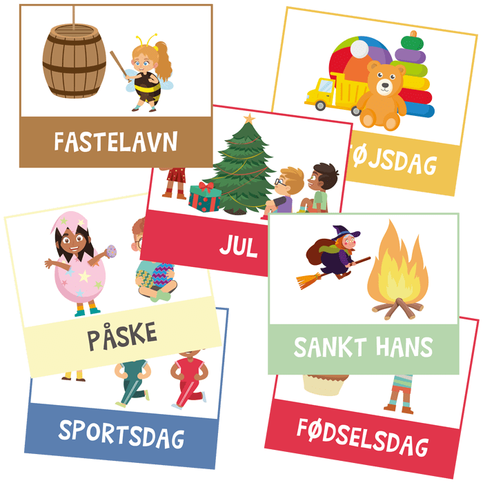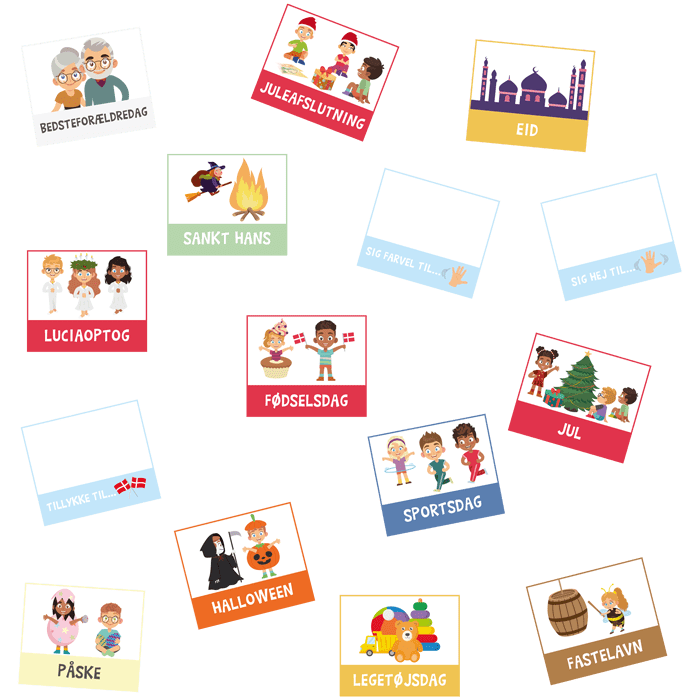 • 15 piktogrammer med mærkedage og begivenheder i størrelsen 13×11 cm.
