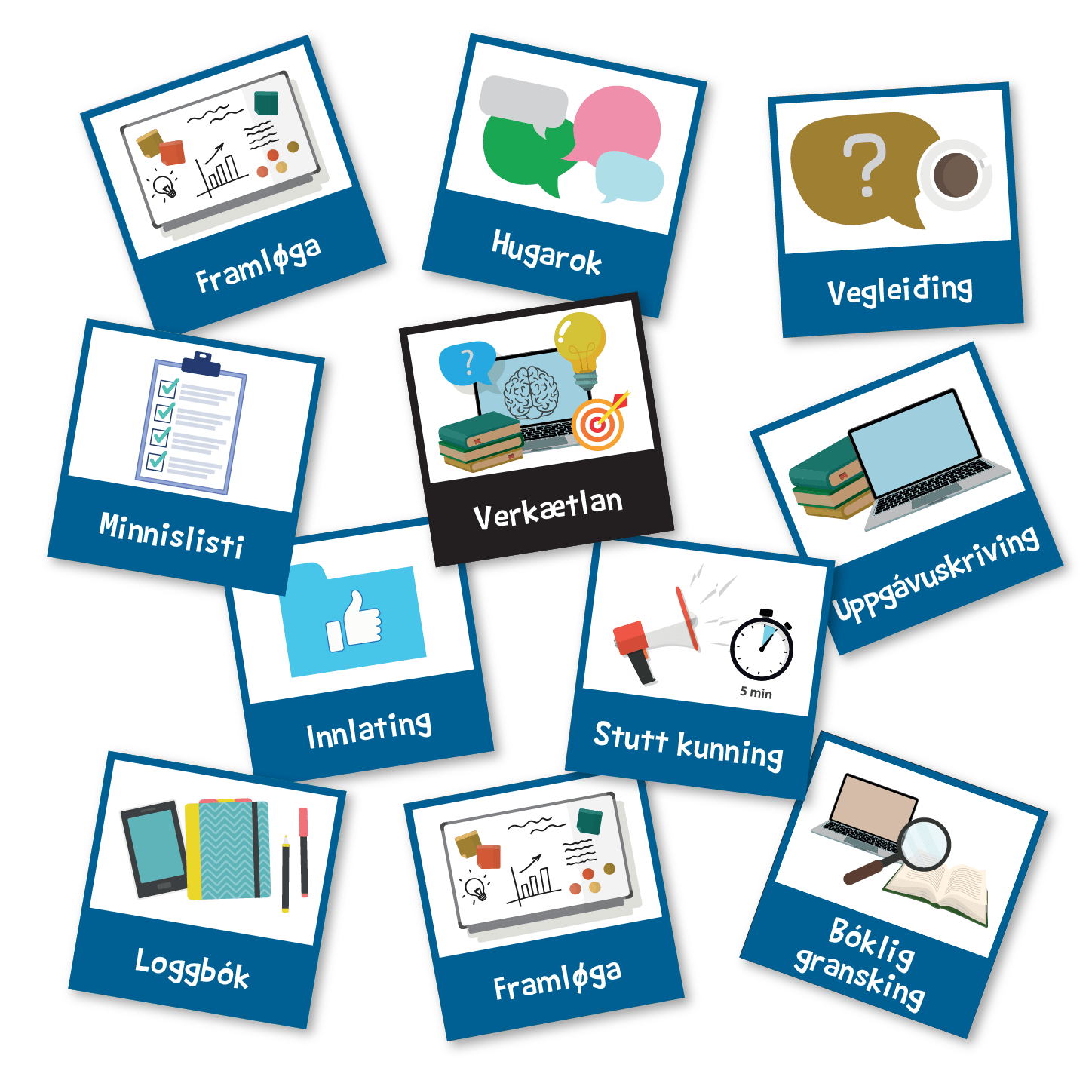 - 24 magnetiske piktogrammer på hver 8×8 cm. der understøtter projektarbejdet.
