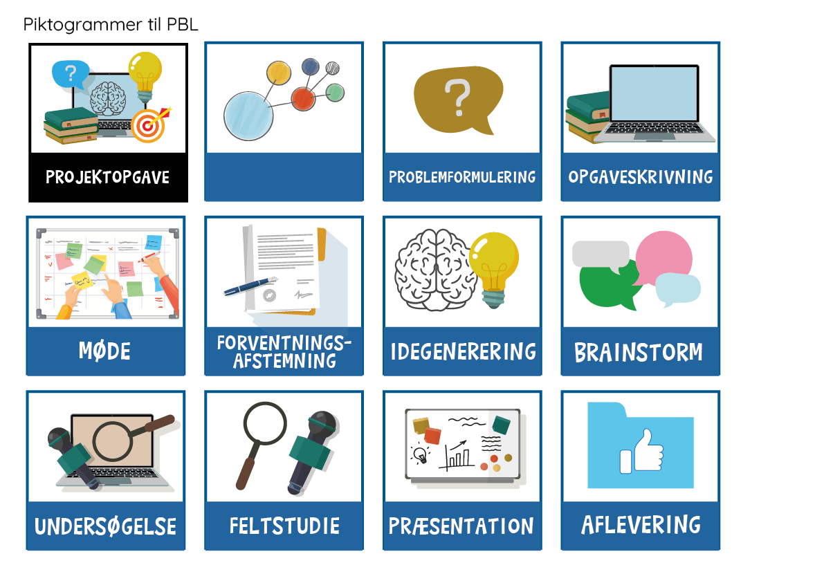 Piktogrammer på tavlen hjælper eleverne til at forstå de mere komplicerede processer omkring projektarbejdet, sætter struktur på dagens forløb og visualiserer aktiviteterne.