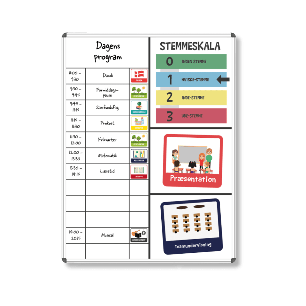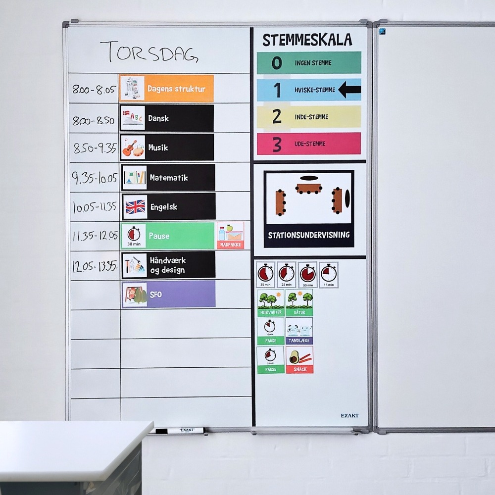 Whiteboardtavle med mange muligheder. Hjælper med at gøre dagens struktur tydelig og ensartet for alle børn og voksne i læringsrummet.